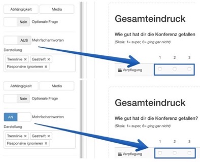 In den Optionen für die "Darstellung" finden sich individuelle Einstellungsmöglichkeiten von Fragen. Hier gibt es für die Matrix nun auch die Einstellung "Responsive ignorieren".