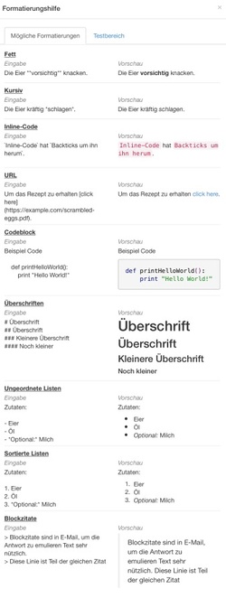 Markdown wird durchgängig in Umbuzoo unterstützt. Die jeweiligen Formatierungsmöglichkeiten für die unterschiedlichen Textelemente werden dabei direkt in der Hilfe angezeigt.