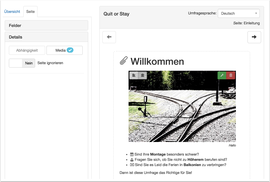 | 3 | Bearbeitung | Hier werden die Inhalte der Umfrage bearbeitet. |